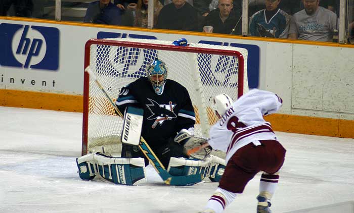 A few starts after his 5 game shutout streak, Brian Boucher made 34 saves to shut down a confident Sharks team.