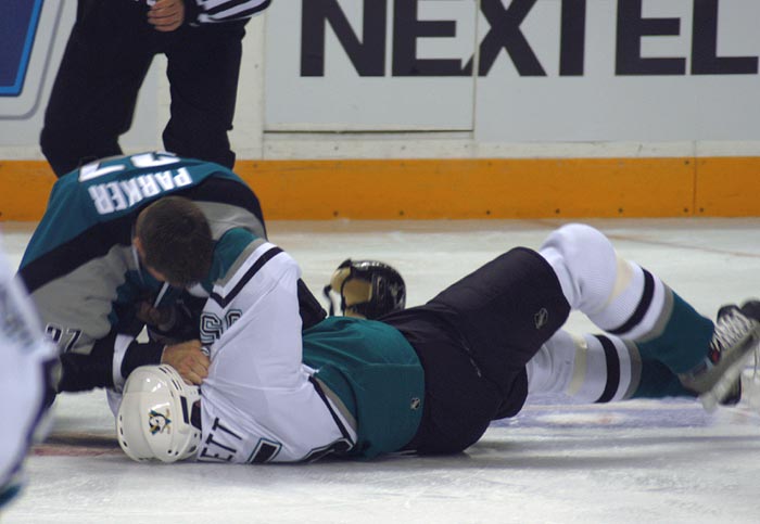 Scott Parker only had 3 minutes and 3 seconds of ice time in the entire game. If I am Sharks coach Ron Wilson, I introduce Parker to Bertuzzi and squelch any ideas of game dominance before they start. Self-preservation would be more appropriate.