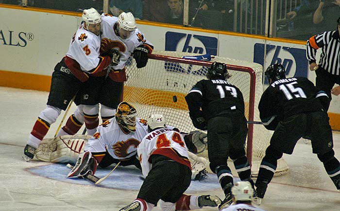 Here you can see the puck cross the line before the Calgary defenseman intentionally knocks the net off its moorings. A penalty was called, but the goal was not allowed. The Sharks did not convert on the power play.